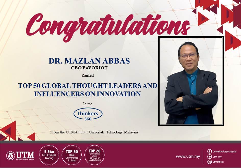 Congratulations to Dr. Mazlan Abbas CEO FAVORIOT for being selected as TOP 50 GLOBAL THOUGHT LEADERS AND INFLUENCERS ON INNOVATION from Thinkers 360.