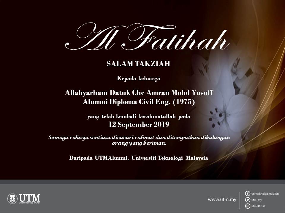 Seluruh warga UTMAlumni merakamkan ucapan takziah kepada seluruh keluarga Allahyarham Datuk Che Amran Mohd Yusoff.