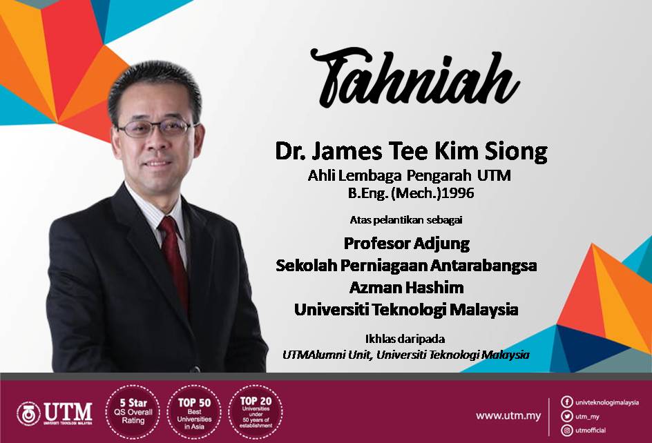 Congratulations to Dr. James Tee Kim Siong, UTM Alumni (1996) for being appointed as Adjunct Professor at Azman Hashim International Business School UTM.